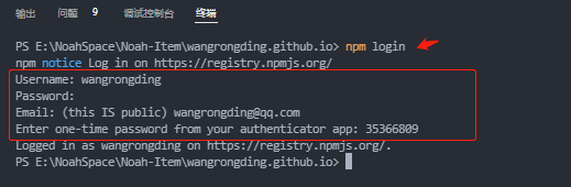 然后执行命令npm login,依次填写用户名、密码、邮箱即可。如果你在 npmjs 站点还设置了其他保护,就还需要输入一些验证码之类的等等…