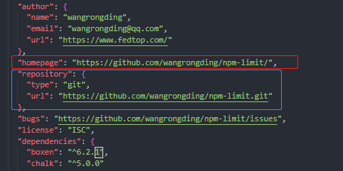 如上图所示,其原理就是:当你要查看的项目中的 package.json 文件中,设置了homepage属性,通过npm docs/home就能打开对应的主页,没有设置homepage属性时,npm 会继续寻找其中的repository属性,这时候打开的就是项目在 github 中的托管地址 url 拼接“#readme” (例如:https://github.com/用户名/仓库名#readme),如果你`repository`属性也没设置,那么就会打开 npm 官网中包的所在地址,(例如:https://www.npmjs.com/package/npm-limit)